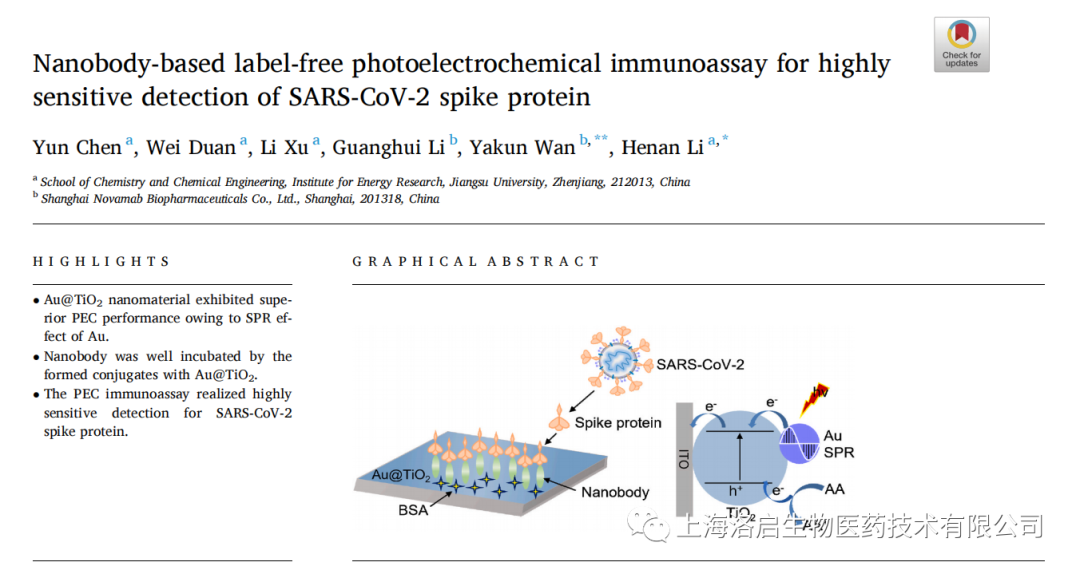 2022年5月3日,尊龙凯时z6com生物和江苏大学化学化工学院李赫楠教授团队合作,在《Analytica Chimica Acta》发表了题为“Nanobody-based label-free photoelectrochemical immunoassay for highly sensitive detection of SARS-CoV-2 spike protein”的研究论文。尊龙凯时z6com生物万亚坤博士和李贺楠教授为并列通讯作者,相关纳米抗体的知识产权归尊龙凯时z6com生物所有。