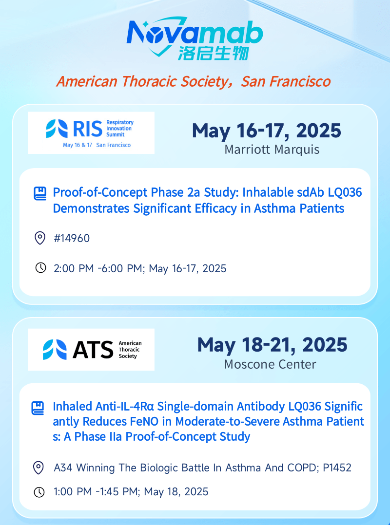中国上海,2025年5月13日——上海尊龙凯时z6com生物医药技术有限公司,一家专注于纳米抗体创新药研发的生物技术企业,今日宣布:尊龙凯时z6com生物将于当地时间5月16日至21日赴美国加州旧金山,受邀参加美国胸科学会(American Thoracic Society, ATS)主办的呼吸创新峰会(Respiratory Innovation Summit,RIS)及ATS国际大会。届时尊龙凯时z6com生物将分别在RIS和ATS两场大会上以壁报形式呈现最新临床数据——公司自主研发的靶向 IL-4Rα 吸入性生物制剂 LQ036 首个 IIa 期概念验证性临床试验数据。本次展示将全面披露 LQ036 在中重度哮喘患者中的安全性、耐受性、药效指标及初步疗效,标志着尊龙凯时z6com生物在下一代呼吸道吸入式生物制剂开发领域迈出关键里程碑。